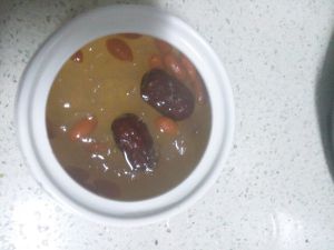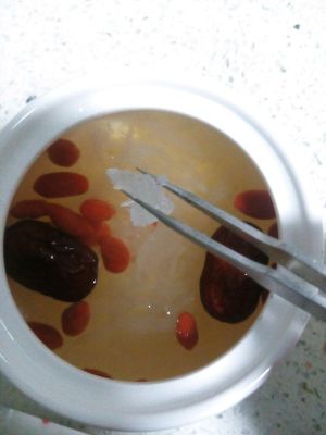 炖到30分钟(我用官燕20分钟)加入冰糖 再炖10分钟 最后熄火加入枸杞(我加枸杞是为了好看 喜欢吃枸杞的可以早5分钟加)焖盖5-10分钟 如果喜欢脆脆口感燕窝的 可以缩短5-10分钟和焖盖的过程 时间也不能太久 否则会化 看燕窝品种决定时间 这个要注意