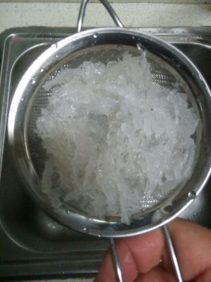 把泡发处理好后的燕窝 撕成一条条的 尽量撕碎点(好漂洗毛)再配合小镊子处理小毛