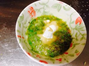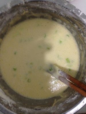 把适量的面粉 鸡蛋 葱花水 加到一起搅拌 少放点盐 依个人口味