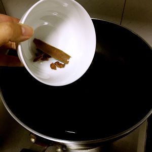 锅里倒入油,小火,放入八角和桂皮~