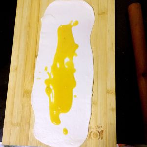 在饼皮上放油酥,刷匀~