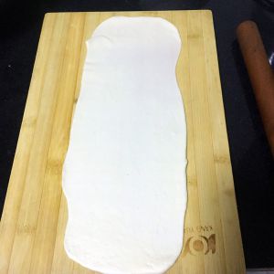 在案板上刷油,把面团擀成长方形薄片,越薄葱油饼分层越多~