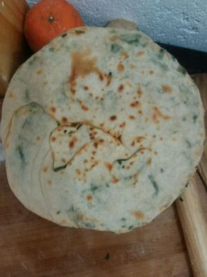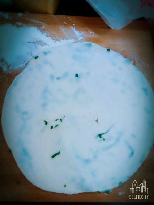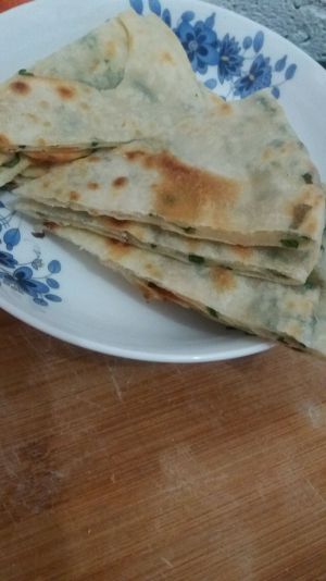 前面的很简单,和面。上葱花,油,盐,五香粉,擀出来这样的