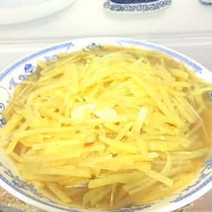 放入土豆丝马上倒醋再倒小半碗水翻炒至土豆丝微透明