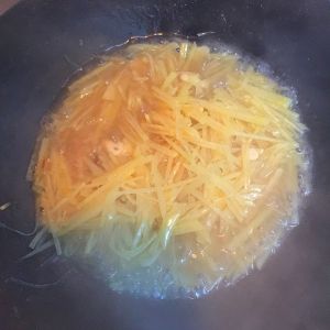 将土豆丝和胡萝卜下锅翻炒,待土豆丝变得剔透时加入适量白米醋继续翻炒即可出锅