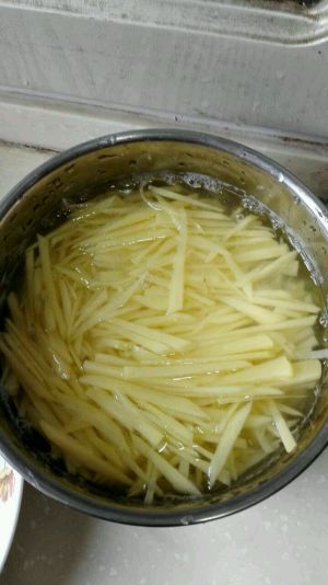 土豆改刀切丝泡入凉水中。(要用刀切丝,不要用擦丝器)