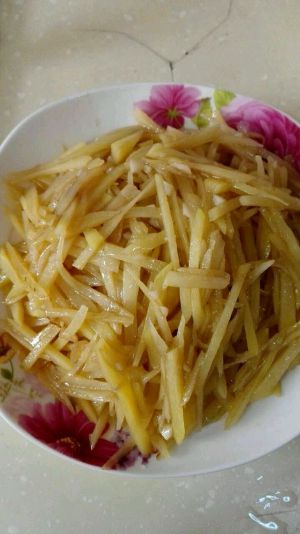 起油锅(油可多放些),倒入土豆丝翻炒,炒至八分熟,放入蒜沫继续翻炒,再加入糖,盐,鸡精炒匀,最后烹入适量的醋翻炒。