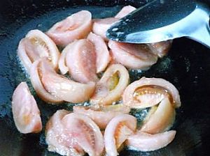 锅中放入适量油,油热后倒入姜和葱白爆香,倒入番茄炒出汁,