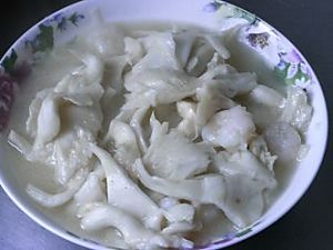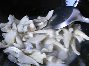 白灵菇洗净撕条,热锅热油煸炒白灵菇。