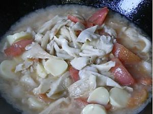 倒入白灵菇,日本豆腐加盐烧滚就可装盘了。