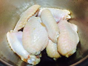 锅中倒入少许植物油,待油温八成时加入鸡翅,炸到鸡翅表面金黄