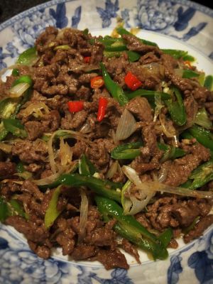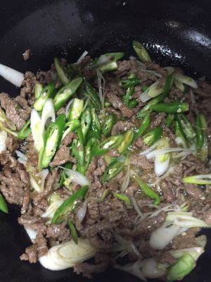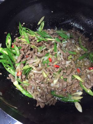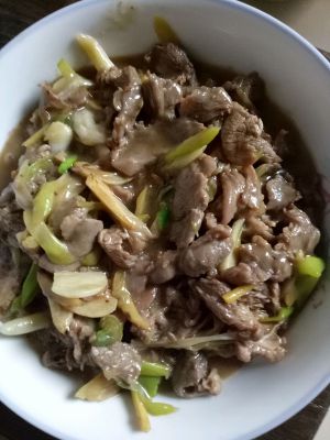 羊肉5成熟加切好的圆葱,翻炒片刻,放入盐,鸡精,孜然,炒至圆葱熟透,出锅。