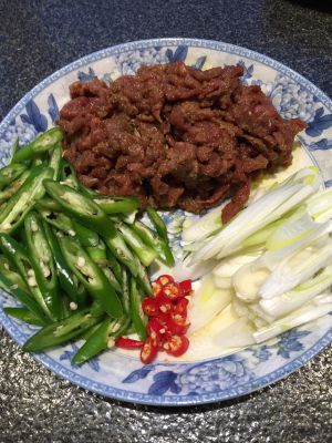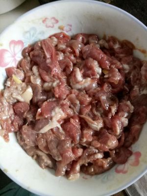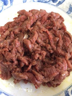 腿肉切细丝,用黑胡椒、孜然粉、粉面、盐、橄榄油、生抽把肉丝腌制。
