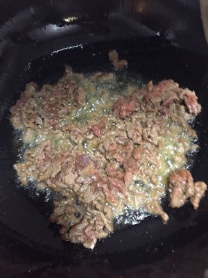 一定少油,一点点就行,因为羊肉出油,油热倒入羊肉,用筷子搅,这样能打散,不用铲子啊,加少许料酒