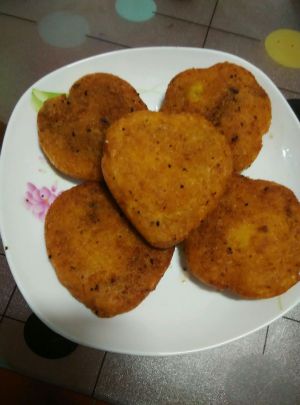 平底锅放油中小火~面饼两面粘面包糠放入锅中~油放莫过面饼一半的量
