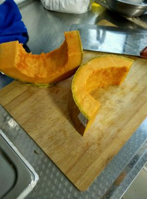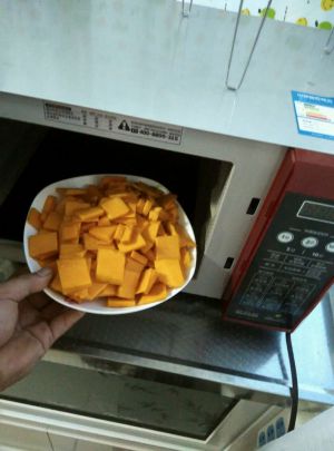 在微波炉将南瓜叮熟,然后乘热,加糖(根据个人口味),捣泥