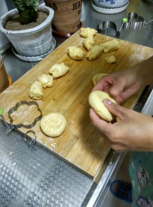 掐面剂子~捏面饼放入豆沙馅、面饼厚一些要不容易漏馅~喜欢在甜一些、可以在豆沙馅里加点白糖~有模具的朋友可以放模具里做出造型来~