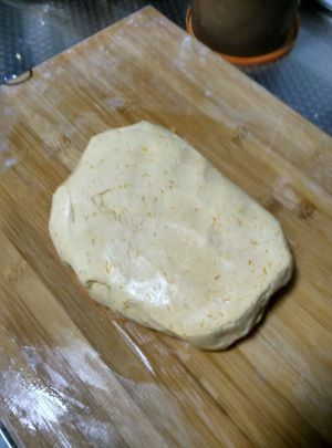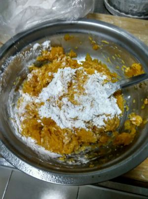 南瓜冷却后搅碎~糯米粉一点一点加入。着急的朋友可以放冰箱里冷却