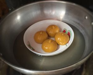 把揉好的糯米团,揪一小团加入一小块芝士在中间,搓圆再压扁。