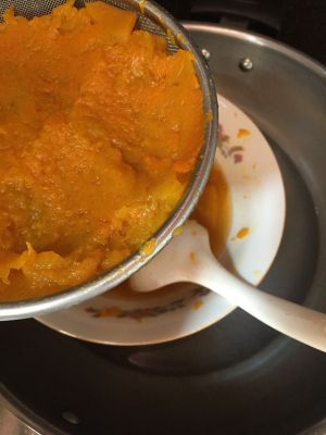 捞出煮好的南瓜块放进搅拌机加入牛奶打成牛奶南瓜泥。