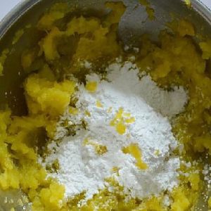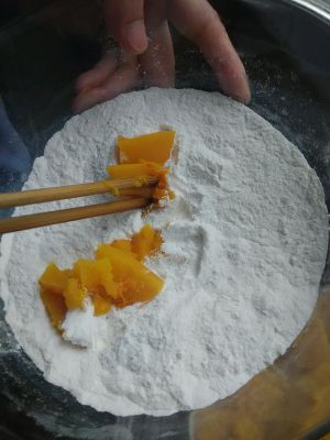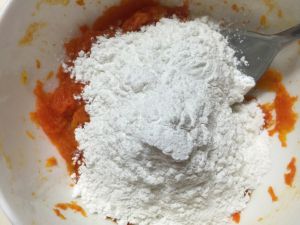 糯米粉倒入盆中,蒸熟的南瓜就热分次加入糯米粉中,搅拌均匀,南瓜中含水较多,搅拌过程中不需要加水,南瓜的加入量以饼坯软硬合适为准,不能加过多南瓜,不然饼坯会太稀不成形。