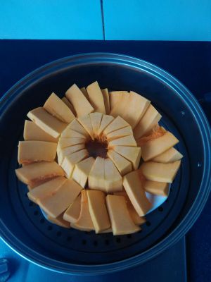 南瓜去皮切片,上蒸笼蒸熟备用。