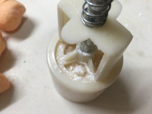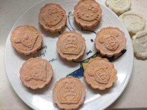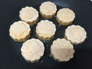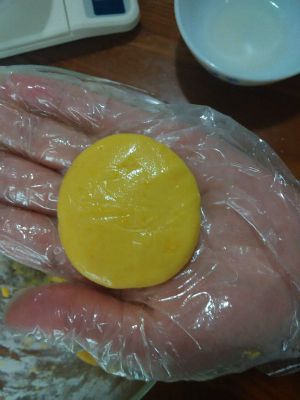 月饼模具粘好干的糯米粉,把刚才包好的南瓜团子放入,压型