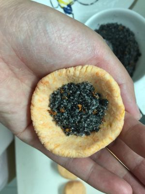包馅搓成圆形,用工具割成南瓜状,顶端放上葡萄干(我这是临时用的枸杞)
