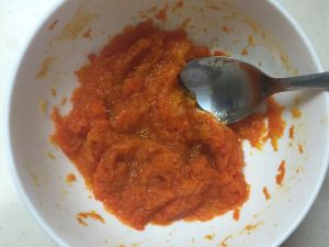 南瓜切小块 放入微波炉加热至熟)或隔水蒸约30分钟)捣烂