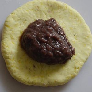 将糯米粉和南瓜搅拌,包入红豆泥,压成饼状下锅煎熟