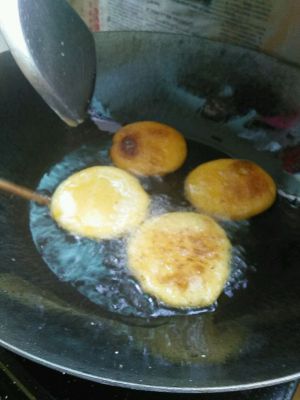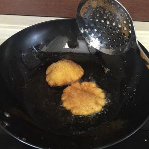 揉成圆圈在压扁 放入烧热的油锅用小火煎一分钟左右至两面金黄