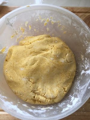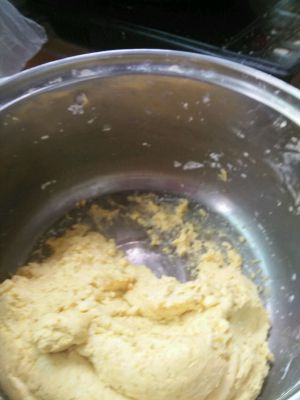 取个大盆,把超市里面买的三斤水磨粉,加两把面粉,一把玉米淀粉拌匀后,倒入打碎的南瓜糊糊,一滴水都不用加,揉成图片这种面团就好了,很多人喜欢使劲多次的揉面,这是错误的,做南瓜饼要想松软,软糯,切记不可反复多次揉面,揉多了饼就硬了