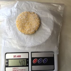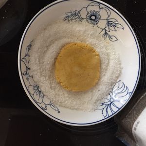 将每个饼团做出40克左右,揉圆并压瘪,两面裹上糯耶丝,待炸