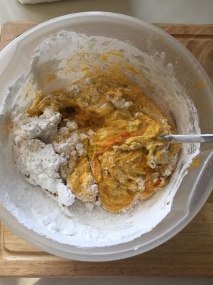 南瓜泥加入一样比例的糯米粉,并加入白糖,最好是棉纱糖,搅拌均匀