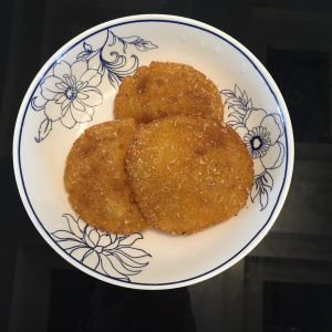 压的扁平,放入平底锅中小火慢煎,不用放油,煎至两面起酥皮就好了