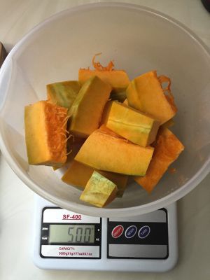 我选了最大的一个南瓜,洗干净去皮切小块,放入蒸箱,蒸了半小时,蒸熟后,我又放进料理机加适量白糖打粉碎,打成糊糊,这样揉进面团会更加的均匀好看!懒得人可以南瓜蒸好后直接揉面