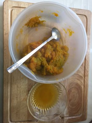 蒸好的南瓜用勺子压碎放凉备用 其实蒸的时候最好拿个盘子,用保鲜膜包住再放到蒸格里面蒸,这样水分比较少。 我直接放蒸锅里蒸的出水太多了有点稀,包馅的时候会有难度