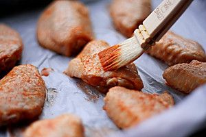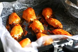 烤盘铺锡纸或油纸,放入鸡翅,为了好看,可以把腌料中的辣椒粉再在鸡翅上点一遍,注意是点不是刷哦!用刷的就把上面的辣椒粉都刷掉了