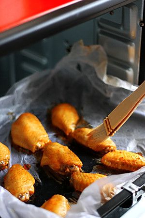 烤箱预热220度,鸡翅放入烤箱中下层,190度上火烤20分钟,然后将烤盘取出,用刷子蘸是烤出来的油,刷在鸡翅表面,再次放入烤箱中,上下火190度,再烤15分钟即可
