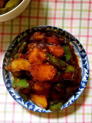 将炸好的土豆、茄子、青椒合炒.放入6g盐,5g糖和少许鸡精.