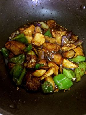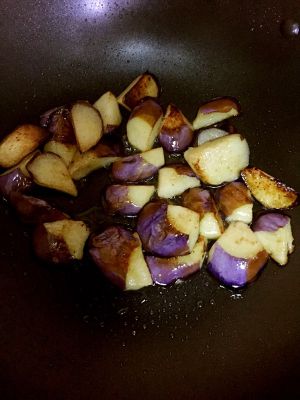 以少量热油爆香葱花及蒜茸, 加高汤、生抽、糖、盐、茄子、土豆和青椒块 略烧;