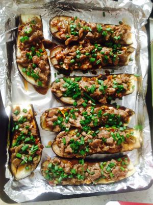 烤箱预热好,烤盘铺上锡纸,摆上蒸软的茄子,淋上调好的汁,烤箱上下火180度10分钟