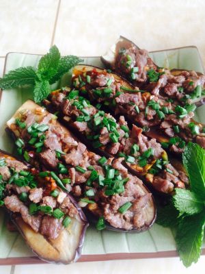 炒好的牛肉粒铺茄子上,洒上葱花,继续大火热八分钟