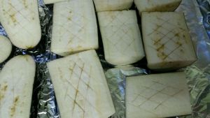 烤箱220度预热三分钟,烤盘铺上锡纸,摆放茄子入烤箱烤30分钟即可。