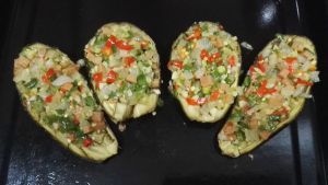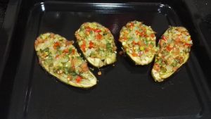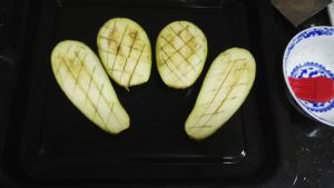 把办好的料涂抹到茄子表面,然后放烤箱继续五分钟到十分钟。我们家的五分钟就够了,然后就可以开吃。