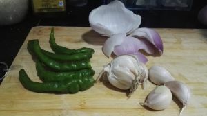 烤茄子的时候,我们先做蒜蓉酱:1把小米椒和1头大蒜,放在料理机中搅碎 ;