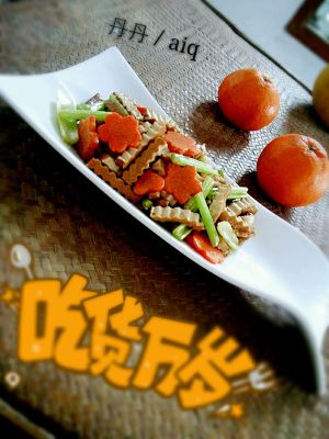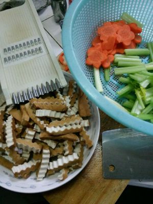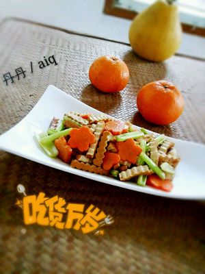 所有原料备齐。香干洗干净用这种厨房用具切成花刀,芹菜洗干净切成和香干一样长度段状,胡萝卜切成片,再用刻花模具刻出花朵形状。