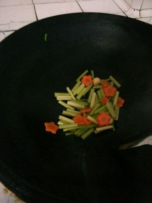 先倒入胡萝卜煸炒两下,然后再倒入芹菜,这两种蔬菜在锅里扒拉几下。