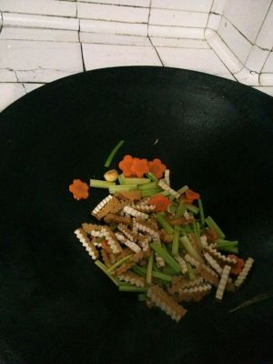 油温5成热时,放入芹菜和胡萝卜翻炒;
