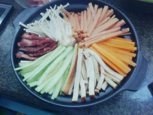 把所有配菜切成丝,可直接摆上,因为最后也得加热